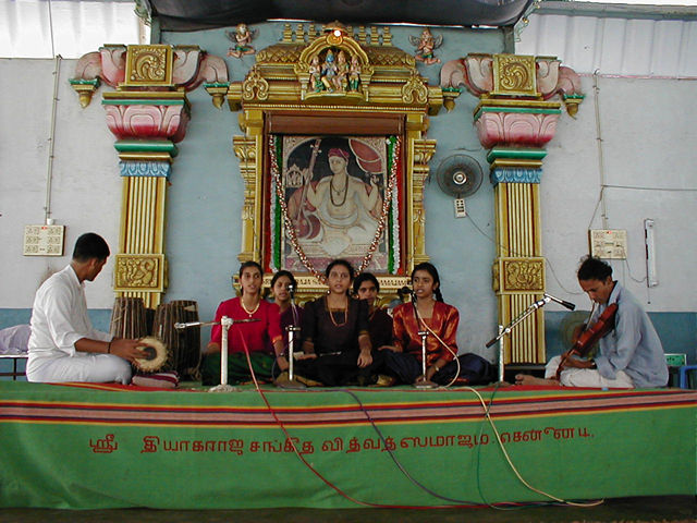 Thiagaraja (1767 - 1847) was one of three famous composers of kirtanas and ragas. He composed in Telugu, the state language of the next state over - Andhra Pradesh. (Chennai/Madras is in Tamil Nadu.) Many of this works praise Rama, an incarnation of Vishnu. Thiagaraja believed one could reach salvation through devotional music. |