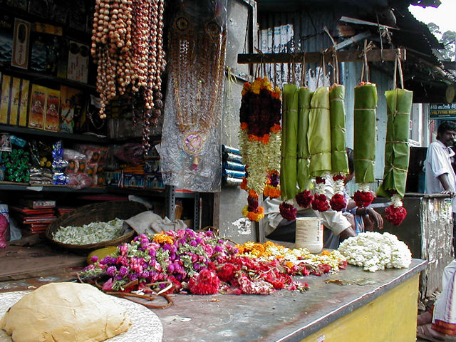 Garlands, some packaged in banana leaves, at a flower stand. |