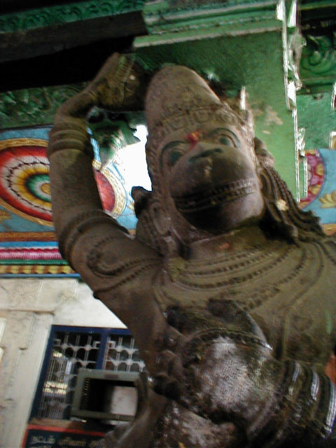 Duncan says this is Hanuman. In Hindu mythology, Hanuman was the divine monkey chief, a central figure in the great Hindu epic the Ramayana ("Romance of Rama"). Accompanied by a host of monkeys, he aided Rama in recovering his wife, Sita, from the demon Ravana. He also acted as Rama's spy in the midst of the demon's kingdom; when he was discovered and his tail set on fire, he burnt down their city, Lanka. Hanuman flew to the Himalayas and carried back the mountain of medicinal herbs to restore the wounded among Rama's army. He crossed the strait between India and Sri Lanka in one leap. In his devotion to Rama, Hanuman is upheld as a model for human devotion to god. |