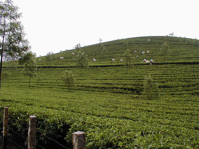 Pickers on the hill. The top leaves of each plant are plucked by hand once every 14-15 days. This gives the plantations a neat look that is odd but pleasing. |