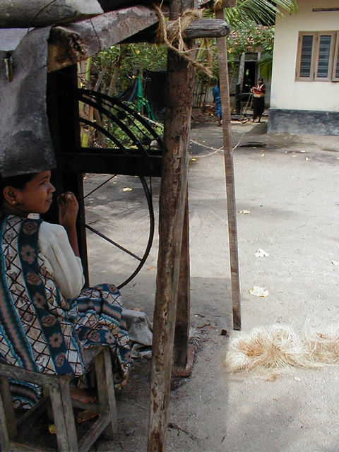 When the strand got long enough to reach the far machine, she attached them to that one, detached them from the machine in the foreground and then twisted the two strands into a rope. |