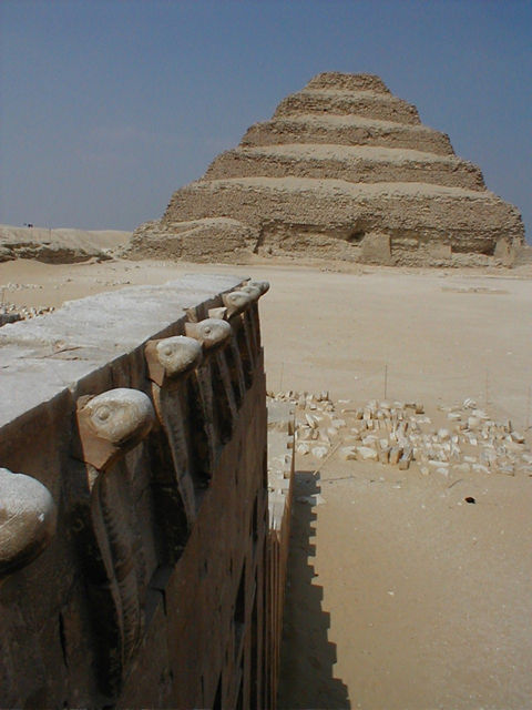 The pyramid and part of a wall featuring a frieze of cobras. The cobra, or uraeus, was a symbol of lower Egyptian royalty |