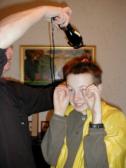 Monica's first attempt at giving someone a haircut. (Followed shortly by Monica's first attempt to even up a haircut which was then followed by Monica's first attempt to repair the damage from her first two attempts.) |