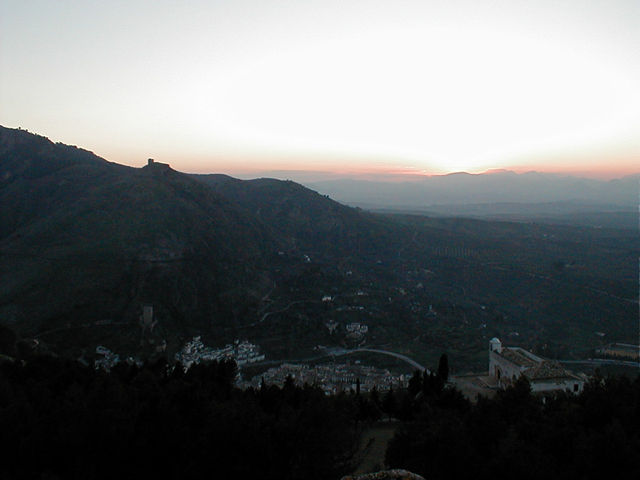 Sunset. The Castillo de Cinco Esquillas is the bump on the left. The Castillo de la Yedra is just below it. On the right is the Ermita de la Virgin de la Cabeza, and Cazorla is in the middle |