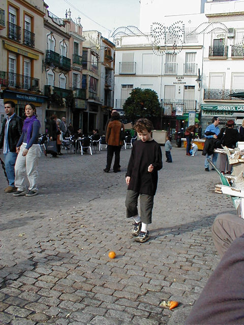 Playing soccer with an orange in Plaza del Salavador (the crowd is mostly drinking glasses of beer from one bar) |