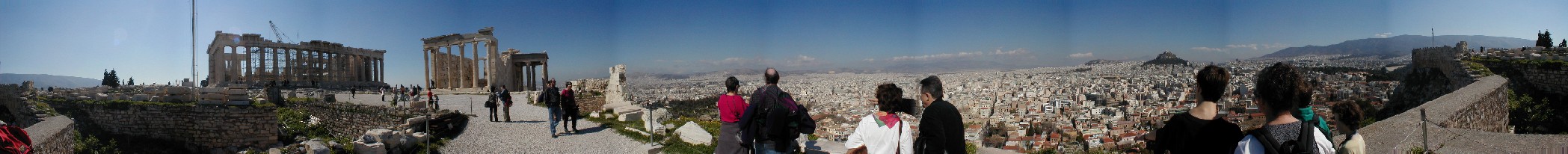 The top of the Acropolis. It was a place of sanctuary since earliest times. Could there be a better place to build a temple? The Parthenon is on the left; The Erechtheum on the right. The goddess Monica is on the far right. |