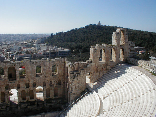 Herodes Atticus, a rich Roman, built a 5,000-seat odeum as a memorial to his wife in AD 161. A conventional Roman theatre except that the semicircular auditorium was hollowed out of the rock, it was roofed in cedar and had a three-story facade of arches. Repaired but roofless, it is now used for the Athens summer festival. |
