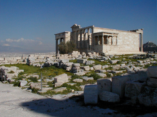 This is the Erechtheum, originally dedicated to both Athena and Poseidon, it was the most venerated of the Acropolis temples. It later became a church under the Byzantines and then the Turkish commander's harem. |