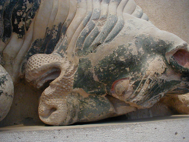 Sculpture from earlier Parthenon. Greek sculputures, though we are accustomed to seeing them in pure white, were nearly all painted. |