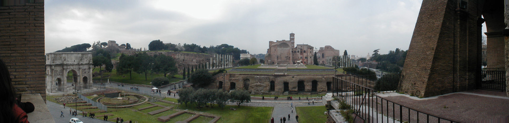 View of the Forum from the Colosseum. On the left is the Arch of Constantine, made from pieces and parts of old art with the heads replaced. Then Palatine Hill and the entrance to the Forum with the Arch of Titus. |