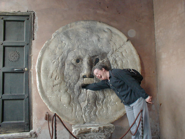 The Mouth of Truth (Bocca della Verita). It's under the portico of the church of Santa Maria in Cosmedin, across the street from the Temple of Huercules. It is believed that the huge face was a drain outlet for the Cloaca Maxima, the great sewer built by the Tarquin kinds to drain marshy areas of the city. It is called the "mouth of truth" because according to medieval legend, anyon putting their hand inside after telling a lie would get bitten. Monica is still recovering. |