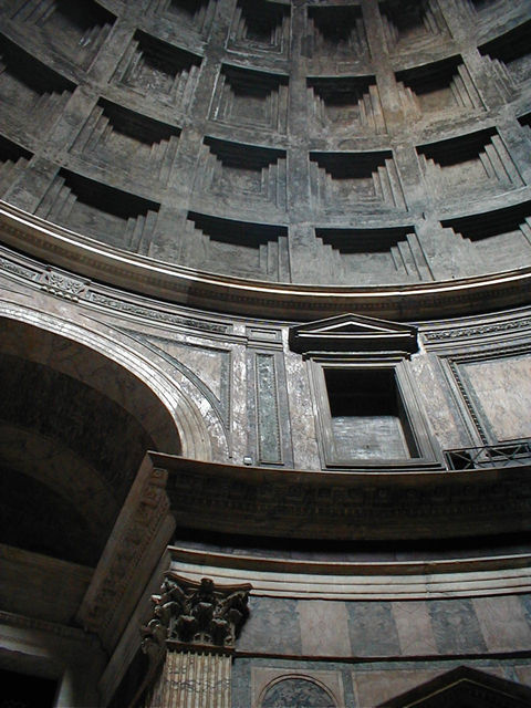 The great dome of the Pantheon. The inside of the building is shaped like a perfect sphere was placed into a cylinder. The Pantheon dome was the largest dome until modern times. The dome on the Florence cathedral was the first in Europe to rival it, and it was not finished until the 1400s. |