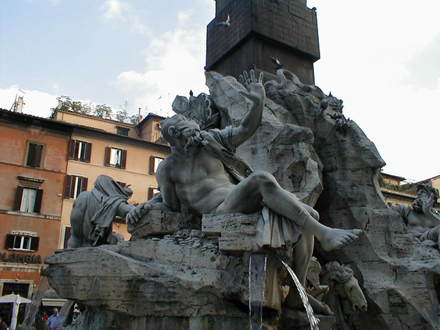 Bernini fountain to four rivers in Piazza Navonna. The figure in the background is the Nile. Its head is covered, because its headwaters were unknown. |
