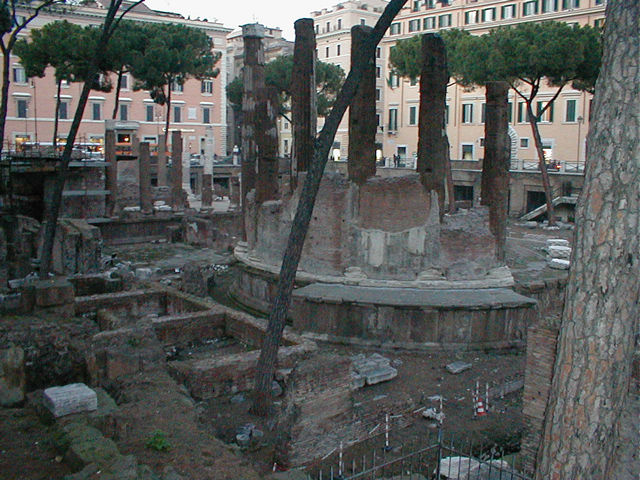 Piazza Argentina's ruins. Site of what is probably the oldest stone temple remaining in Rome - dedicated to Feronia, the goddess of woods and vegetable gardens. It's in this area that Caesar was assasinated beneath the statue of his rival Pompey. |