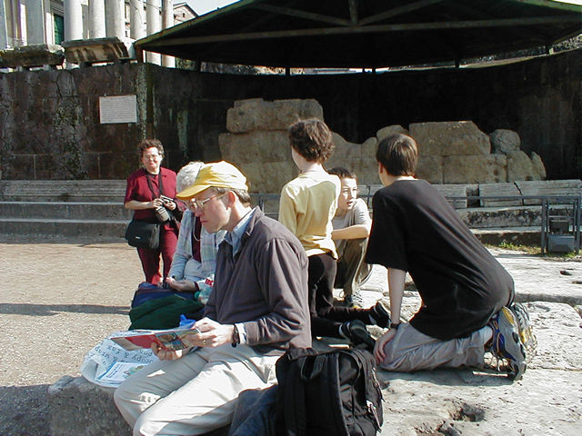 Our picnic spot. Sitting in front of the Temple of Divus Iulius. After Caesar was assasinated, his body was carried to the Forum and burned on a pyre. An altar was built on the spot and then a temple. Augustus, Caesars adopted son, had his father honored as if he were a god by dedicating this temple to him. People still leave flowers on what remains of the temple. |
