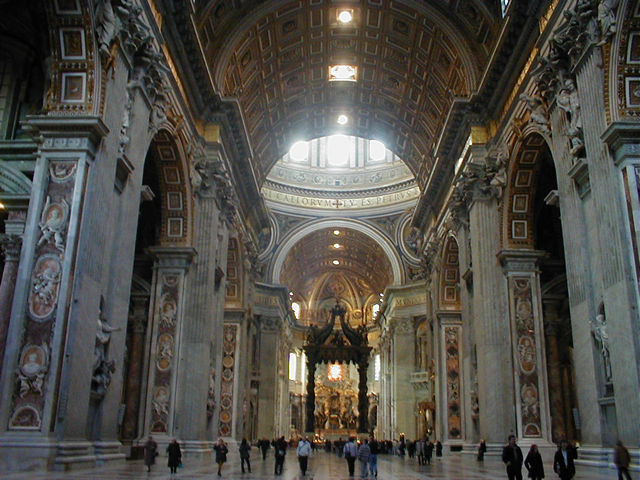 Looking up the nave of St. Peter's. Michelangelo, who was not the original architect, designed a church that would have a the shape of a Greek cross - one in which all the branches are equal. After Michelangelo died, the plan was modified to a Roman cross - like the cross above western altars. The window at the end of the apse is two football fields away. The canopy over the altar is seven stories high. The statues sunk in the pillars along the sides are 15 (bottom statue) to 21 (top) feet tall. |