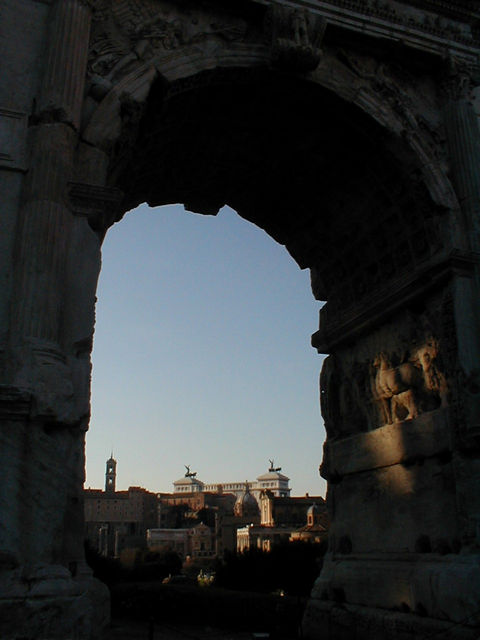 Looking through the Arch of Titus across the Forum and over to the twin top of the Victor Emmanuel Monument |