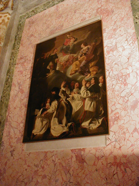 A painting in St. Barbara's showing the Virgin, various saints, and the bookseller who paid for the painting. |