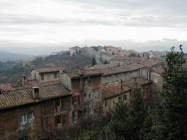 View from stairs between Piazza Rossi Scotti and Via Bartolo. You can see a city wall running up the middle of the photo. On the |