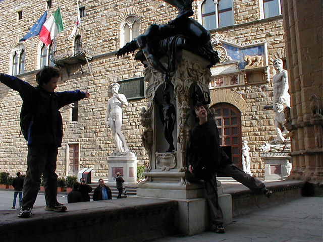 Silly children on the Loggia, just before the police woman told them not to touch the sculpture. They obeyed the policewoman and not their mother. |