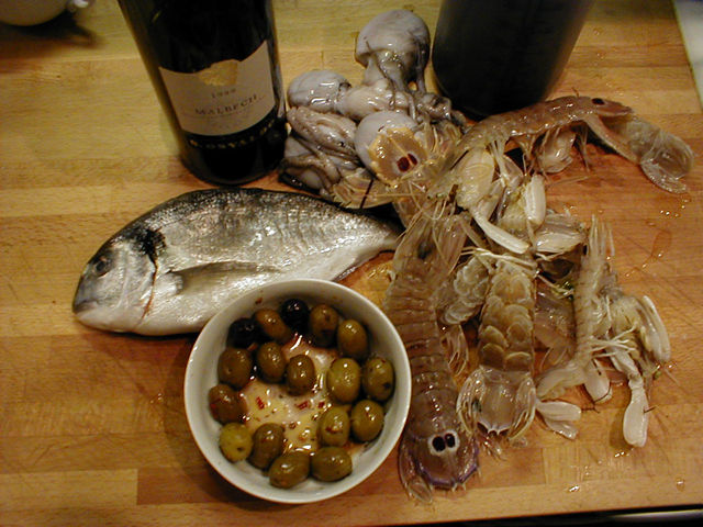 Monica's favorite sort of art. A still life you can eat. Wine, fresh seafood, and olives. |