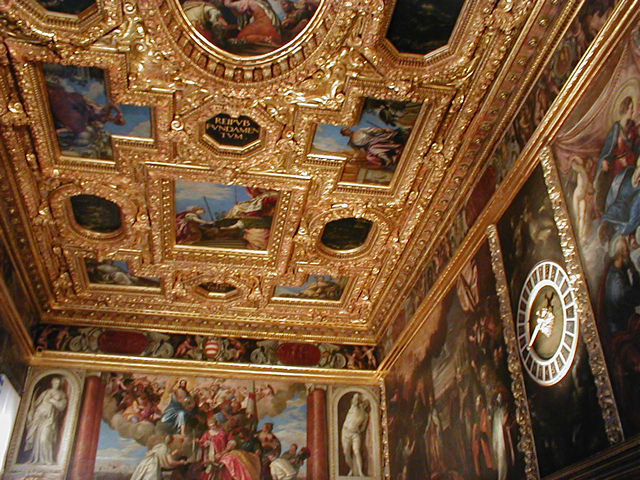 The Collegio. The doge received ambassadors here, and it's where the Pien Collegio met to prepare bills to send to the Senate. The paintings are by Paolo Veronese. It's hard to tell from the photo, but that's a 24-hour clock on the wall. The painting just "below" the black oval shows Venice enthroned receiving a sword from Justice and an olive branc from Peace. |