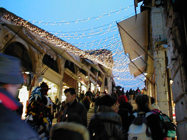 Rialto Bridge. It's one of only three that cross the Grand Canal. It was the only bridge across the Grand Canal on foot until 1854 when the Accadema bridge was built. |