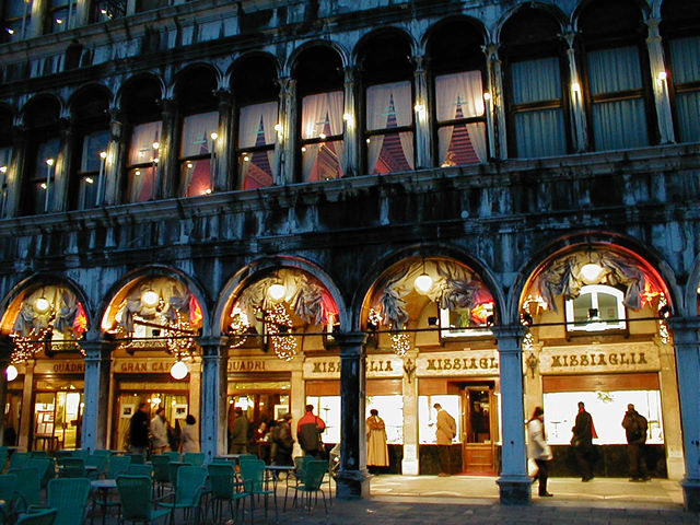 Shops along Piazza San Marco. You can also see cafes. The first coffee shop was opened on San Marco at the end of the 17th century. By the 18th century, there were 24 in Piazza San Marco. |