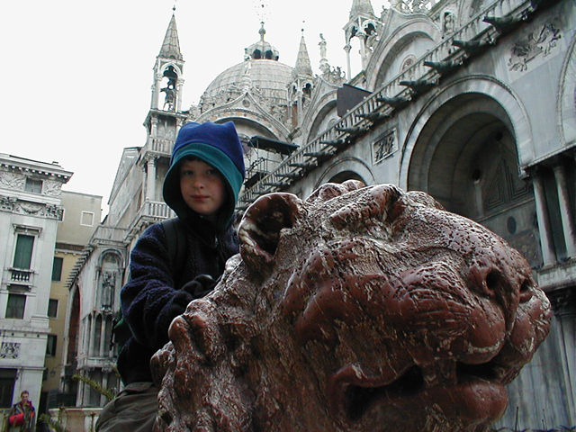 Maggie riding one the lions next to San Marco in Venice. |