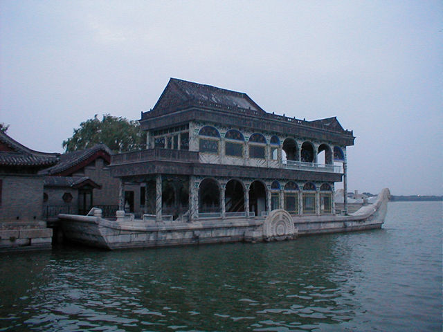 Rumor has it that Cixi renovated the place with money intended to give China a modern navy, and - the story goes - this is the only boat the Chinese got. This one is marble and was fitted with mirrors. The empress dowager used to dine here. |