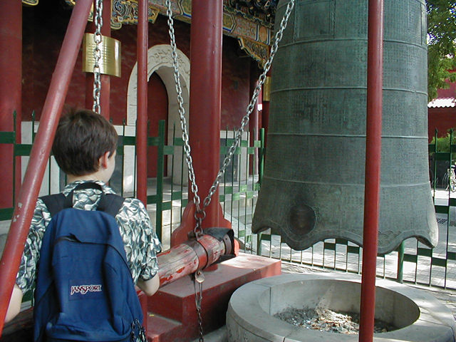 Tote pretending to ring a big bell at the Lama Temple. Amazingly, one must pay for the privilege, which is why Tote is only pretending. |