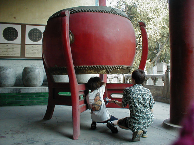 A drum with drum stele in the background. The drum stele are essentially peculiar stone tablets recording one thing or another. |