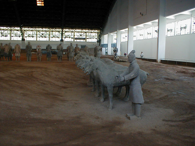 The tomb itself, one of our first wrong stops on the bus, remains unexcavated. It lies within an inner wall and beneath a four-sided pyramid mound that was originally landscaped to appear as a low, wooded mountain. The interior is reputedly a vast underground palace that took about 700,000 conscripted workmen more than 36 years to complete. Today the mound has a stairway and lots of tourists running up it. |