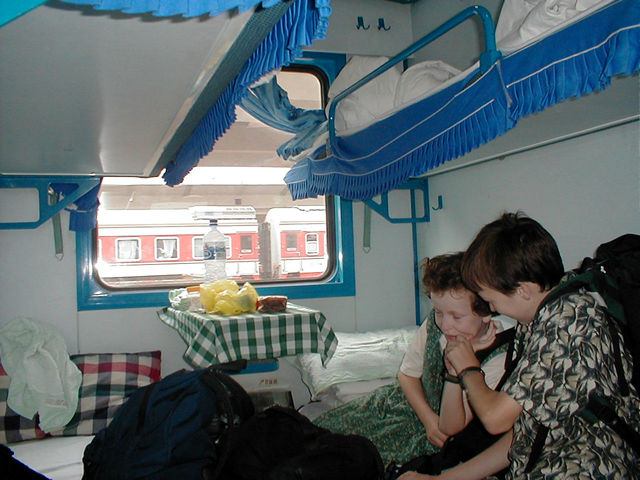 Tote and Maggie goofing around. Unlike the Indian trains, one can see out of the large, clear windows. |