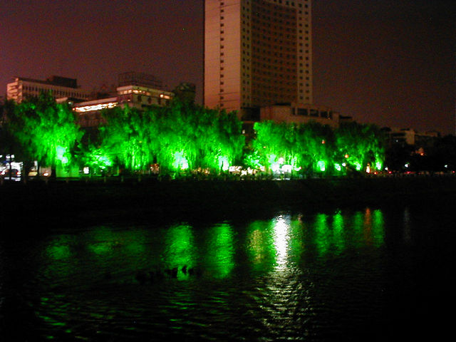 Back along the river in Chengdu. We again got on a bus having only the vaguest idea where we were headed. The driver assured us all would be well, or maybe he was just saying he would be well if we paid our fare and got on his bus. In any event, the bus stopped at a city bus stand, the driver said "28! 28!" and drove off. We should have followed his advice and hopped on bus number 28, instead we decided to take a taxi, figuring we could be certain we would get to our hotel. Trouble was, we didn't have anything showing the name of the hotel in Chinese characters and only knew the English translation of the name. Finally, we found a slip of paper with the name of one of Chengdu's fanciest hotels on it. We figured we could walk from there. But, we we got downtown, we were able to direct the driver to the hotel without a problem. Bus number 28 would have stopped two blocks away for a third the price. |