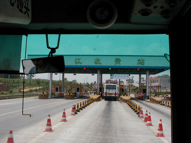 Tollgate on the highway to Emei. We got on the bus without any clear idea of where we would end up. We had a slip of paper with the name of our intended destination on it, but the ticket agent crossed that name out and wrote something else on our slip. She then sold us 5 tickets and 50 slips marked "one yuan" for which I paid 50 huan. After about three hours and one stop we arrived at a bus station. A mini-bus driver immediately offered to drive us to our starting place for 50 yuan. I offered her our insurance slips. She tried to explain to me what the slips were or weren't. I suspected they weren't another ticket but figured waving them around was helping with the bargaining. She led me inside the bus station where a big discussion occured between our original driver, some official acting guys, and a policeman or two. It was pretty clear that everyone was telling the driver that he had somehow goofed and should figure things out. It turns out we should have gotten out at the first stop. Eventually, the driver paid the woman from the mini-bus 10 yuan to take us back to the last stop. The slips turned out to be the "insurance" required of every foreigner who takes a cross-country bus ride. |