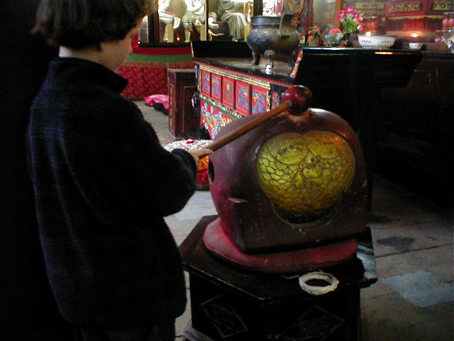 Maggie banging on a gong.