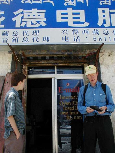 In front of an internet place. Notice the sign is written mainly in Chinese with Tibetan in the small letters on top. In the Chinese part of town, there is often no Tibetan at all. |
