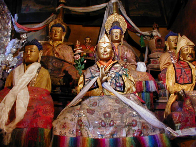 At Sera monastery, founded in 1419. This is a statute (we think) of the Fifth Dalai lama. Statues like these are the most obvious feature of the chapels in monasterys. They may be of famous lamas, gods or goddesses, and now and then a very famous human. Commonly called the Great Fifth. He established, with the military assistance of the Mongols, the supremacy of the Galugpa sect (the "Yellow Hats") over rival orders for the temporal rule of Tibet. He also built the Potala. |