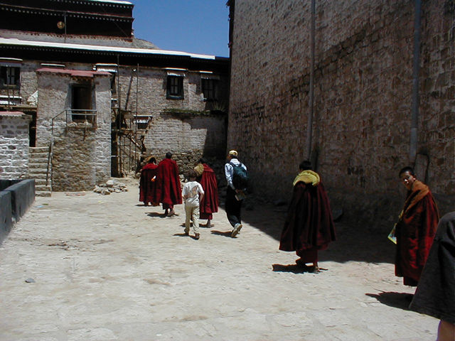 Mark and Maggie following the monks. They had just gotten out of class and were headed to their living quarters. |