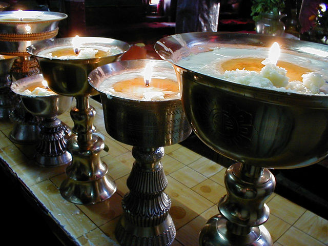 Butter lamps in the chapel. These are traditionally filled with yak butter, but nowadays they are mainly filled with vegetable ghee. |