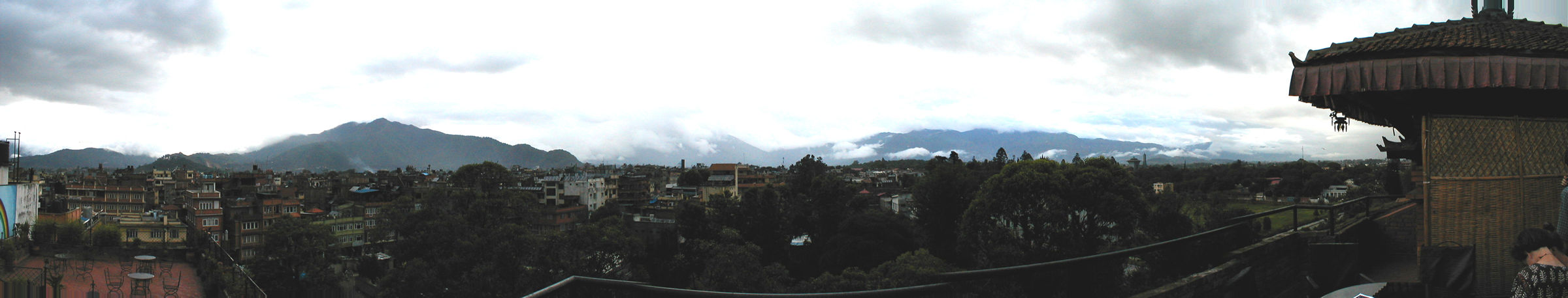 View from the roof of the Kantipath Temple Hotel - a lovely place. Though we didn't stay there, we loved the view, the architecture, and the staff. Our hotel, Sidharta Guest House is visible as the low greenish colored building to the left of the righthand railing. Swayambhunath is partway up the hill at the base of the tallest hill in the background. Poking up from the trees on the righthand side is something that looks like a tall pagoda next to something that looks like a modified obelisk - that's the Royal Palace. The antennae just to the right of that is on the American Embassy grounds (I think). |