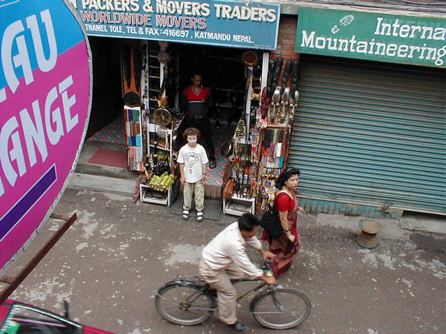 Maggie exploring a shop across the street from Hotel Norling. This is in a part of Thamel that is actually less touristy than other parts, but you can see from the signs that it is still pretty touristy. |