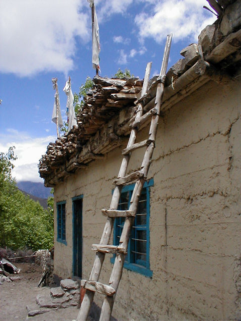 Roof with wood and a familiar (and here, unusual) kind of ladder. |