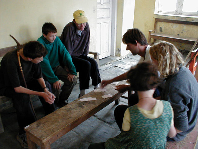 Playing cards with Kris and Veerle. Our flight was scheduled for 7 AM, but this time of year, none of the flights go on schedule. Many don't go on the correct day. After 10 AM, passengers can leave. A siren sounds in Jomsom, when a plane leaves Pokhara. Since it takes about 17 minutes to get to Jomsom, there's no problem getting to the airport in time. |
