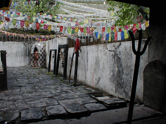 The trident symbol of Vishnu and prayer flags usually connected with Buddhism |