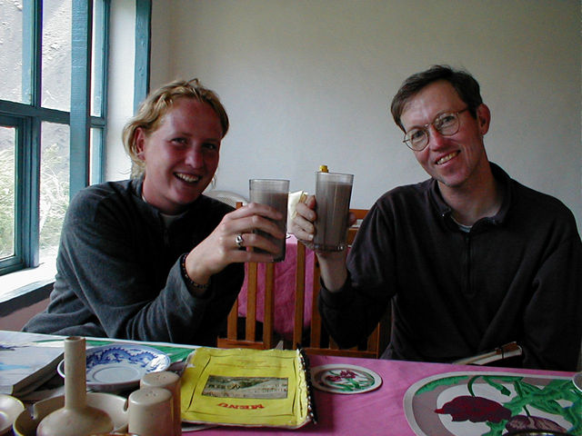 Veerle and Mark toasting with the (very) local beer. A fermented, thick barley concoction. |