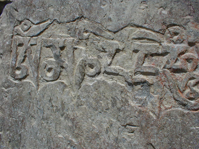 "Lama stone" or stone with prayer carved on it. No Nepalese person that we met could explain where they came from or knew what they said. The could only say that the lamas bring them and put them on the cairns that are all along the trail. |