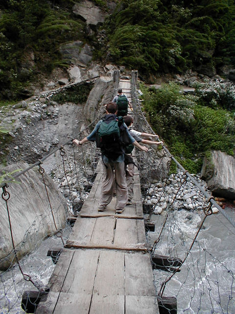 Good, that means scary, suspension bridge. This one moved and the side cable were too far to grab at the end. |