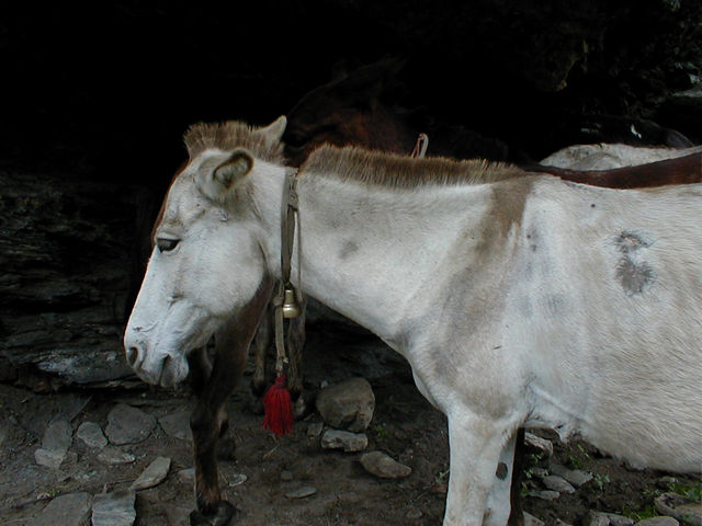 A mule. The mules seem to end each day with bleeding saddle sores. You can see scars on this one.